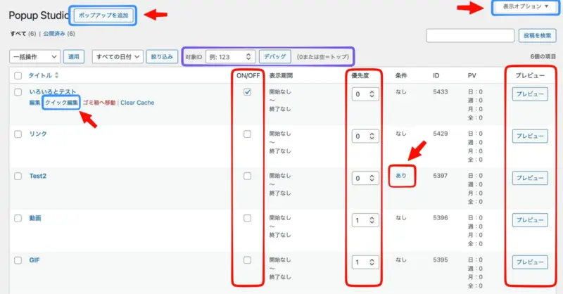 「Popup Studio」(一覧画面)は、作成したポップアップを「まとめて管理するための画面」です。