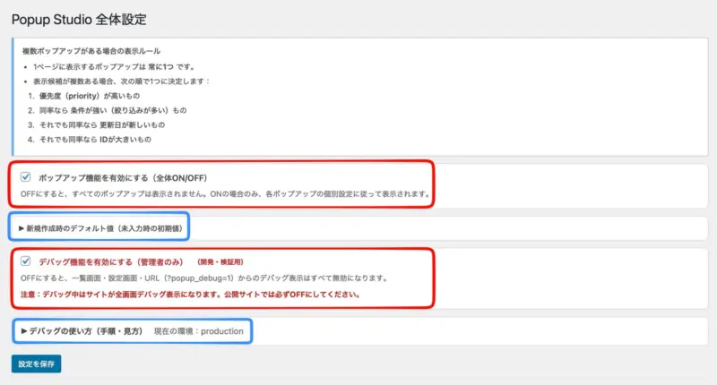 赤枠の部分は、ポップアップ機能のON/OFFの選択、ディバッグのON/OFFの切り替えとなります。