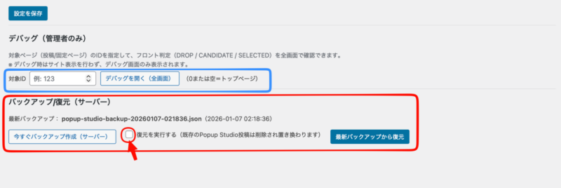 バックアップ機能は、ポップアップの設定内容(投稿データ・メタ情報)を、誤操作や不具合に備えて退避・復元できる仕組みです。